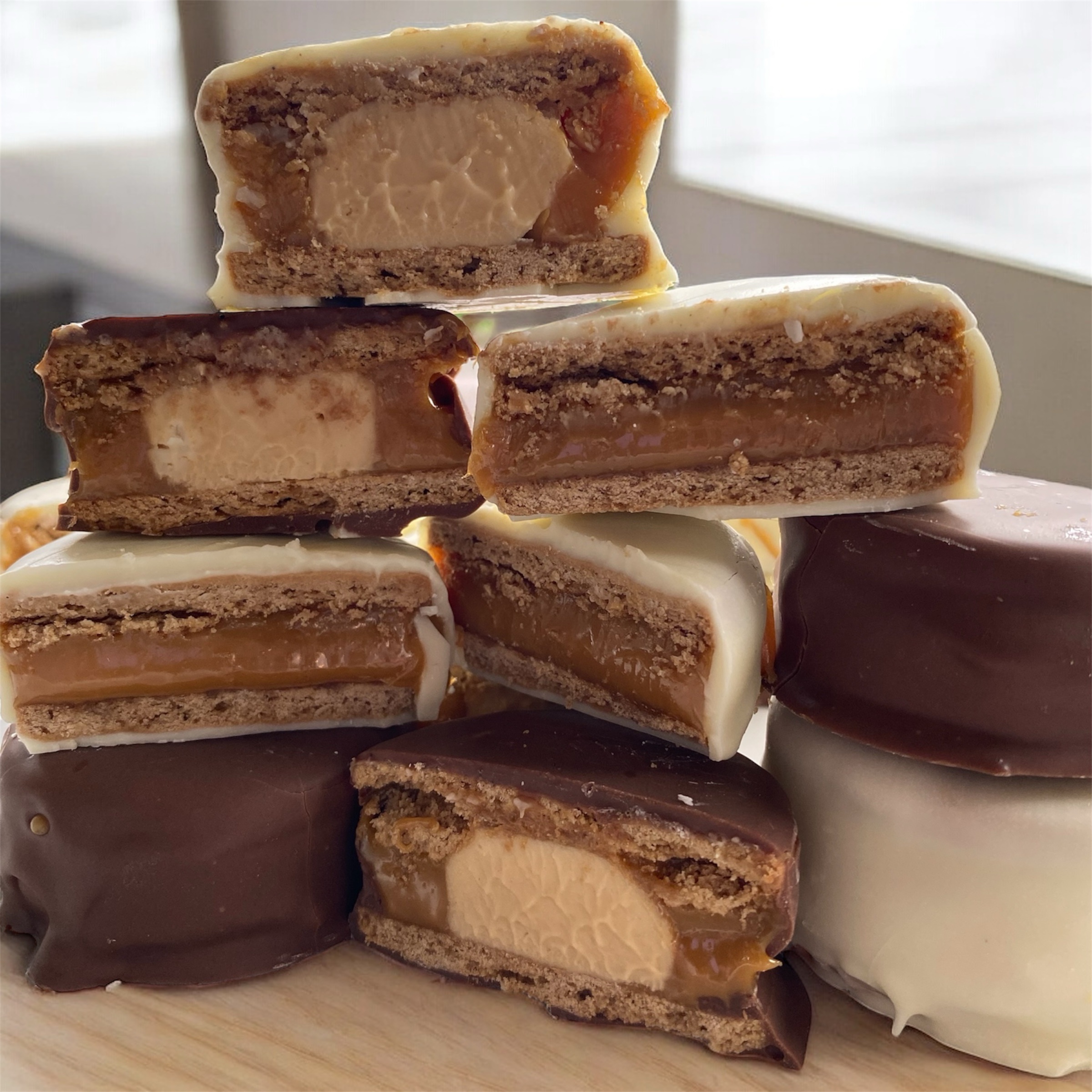 Galleta de vainilla, relleno: manjar blanco y bombón chocolate blanco maní, bañado: chocolate blanco o de leche